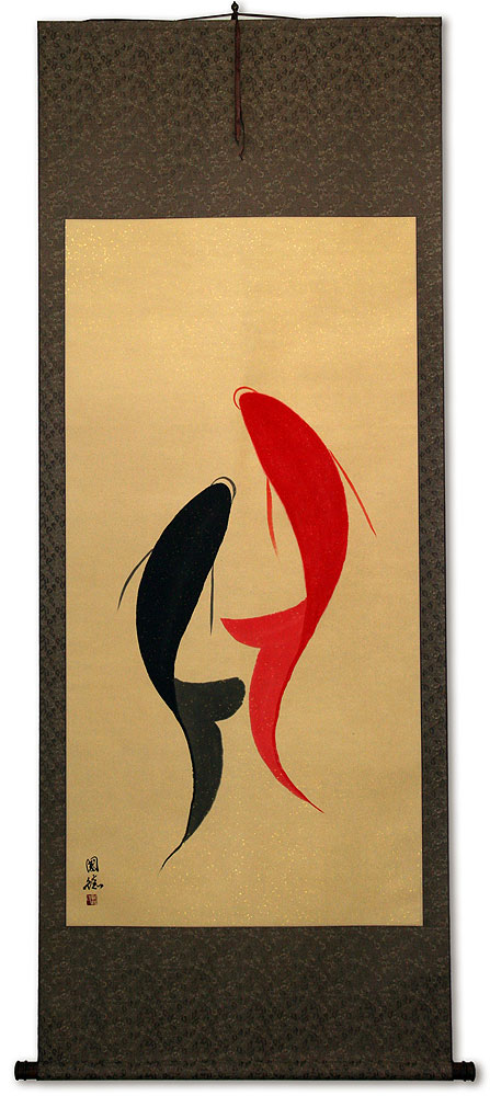Close up view of the koi fish artwork mounted to this silk brocade wall scroll