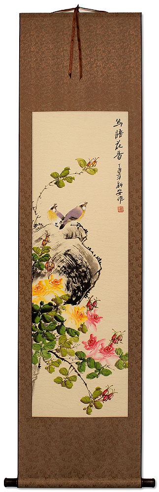The Chinese title written on this artwork means "Scent of Flowers and Bird Song" or "Flowers Fragrance, Birds Talk". Also written on the painting is the artist's signature.