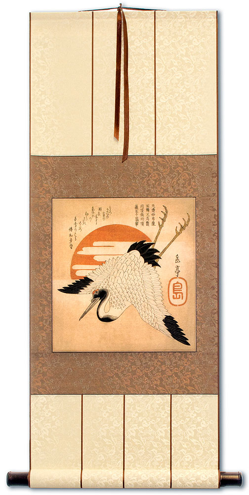 Crane and Rising Sun Wall Art - Japanese Woodblock Print Wall Scroll